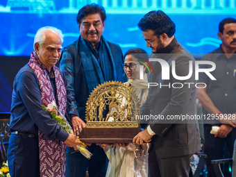 Mamata Banerjee, West Bengal State Chief Minister, is with film producer and director Ramesh Sippy, Member of Lok Sabha and actor Shatrughan Sinha, and former India cricket team captain Sourav Ganguly during the inauguration of the 31st Kolkata International Film Festival (KIFF) at Dhono Dhanyo Auditorium in Kolkata, India, on November 6, 2025.