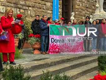 A crowd of people, many wearing red attire, gathers during the L'Eredita delle Donne (The Legacy of Women) festival, a major event dedicated to female empowerment and skills, in Florence, Tuscany, Italy, on November 22, 2025. Participants hold a banner that reads ''Donna Vita Liberta'' (Woman Life Freedom). Speakers address the attendees while others hold up signs protesting violence and injustice, demonstrating active participation in the festival's focus on women's rights and visibility. The event takes place in an outdoor urban setting with historic stone architecture visible in the background.