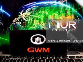 In this photo illustration the GWM logo, auto motor company from China, is shown on a mobile phone against the illustration of a world map and stock graphs displayed on a computer screen as Chinese electric cars continue to rise its sales in Europe - November 30, 2025.