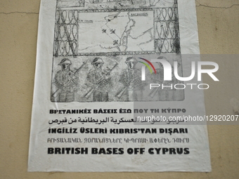 NICOSIA, CYPRUS - OCTOBER 21: A poster reading 'British Bases Off Cyprus' is seen in the center of Nicosia, Nicosia District, Cyprus, on October 21, 2025.