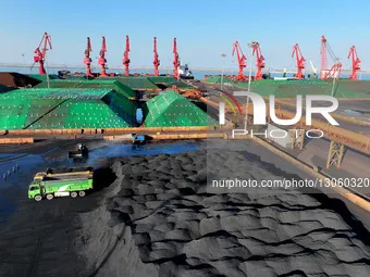 The transport truck transports electric coal at the coal terminal of Lianyungang Port in Jiangsu Province, China, on December 5, 2025.