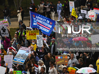 Demonstrators march during an anti-Trump protest in Washington, D.C. on November 22, 2025. The march and rally, hosted by the 50501 organization, called for the impeachment and removal of President Donald Trump from office.