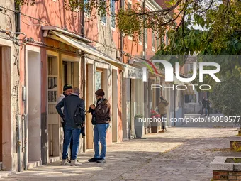 A group of locals stands and talks on a sidewalk next to residential buildings on Murano Island in Murano, Venice Province, Veneto, Italy, on November 18, 2025. The social scene captures daily life on Murano Island, highlighting Italian living and the local neighborhood.