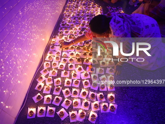 Hindu devotees sit together in front of oil lamps and pray to Shri Shri Loknath Brahmachari, a Hindu saint and philosopher, as they observe the Rakher Upobash festival at a temple in Kolkata, India, on November 8, 2025.