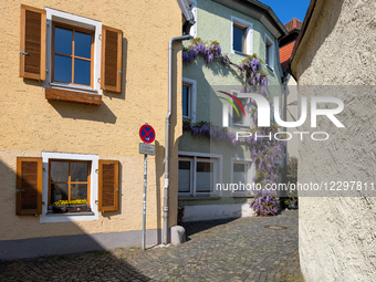 A narrow cobblestone lane with pastel-colored houses and blooming wisteria climbing the facade is seen in Regensburg, Upper Palatinate, Bavaria, Germany, on April 19, 2025. Traditional wooden shutters, flower boxes, and a no-parking sign are present in the residential old town setting.