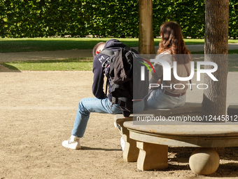 A young couple sits on a curved bench in a park, with the man leaning forward and holding his head while the woman sits upright beside him, in Prague, Czech Republic, on May 11, 2025.