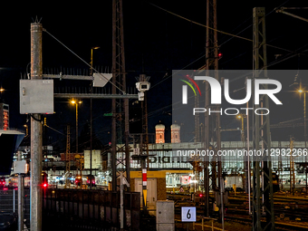 Railway infrastructure and tracks belonging to Deutsche Bahn are illuminated at night outside Munich Central Station in Munich, Bavaria, Germany, on October 30, 2025. In the distance, the twin spires of the Frauenkirche are visible above the station building.