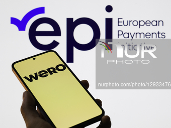 The Wero logo is displayed on a mobile phone with the European Payments Initiative (EPI) in the background, in this photo illustration in Brussels, Belgium, on November 1, 2025.