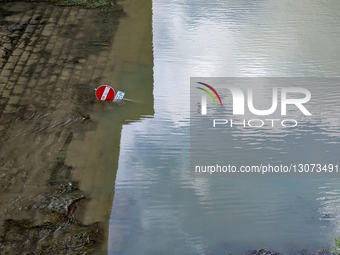 A round, red and white traffic sign indicating a prohibition (a one-way street) is partially submerged in brown water near a riverbank retaining wall, reflecting the cloudy sky above. This scene is in Florence, Tuscany, Italy, on November 21, 2025, and symbolizes temporary high water conditions.