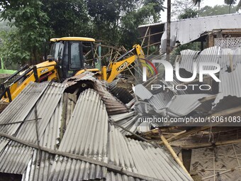 An excavator demolishes a structure during the eviction drive at Rupahi Bhakat Gaon in Nagaon District, Assam, India, on December 5, 2025.