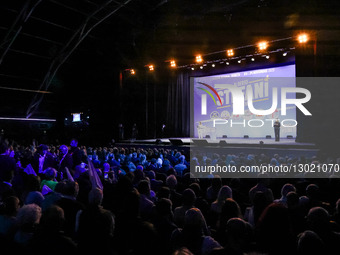 A moment of the closing event of the center-right coalition's campaign for the Veneto regional elections in support of Alberto Stefani takes place at the Gran Teatro Geox in Padova, Italy, on November 18, 2025