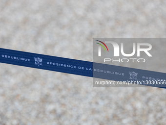 The illustration photo shows a ribbon that says ''Presidency of the Republic'' in the courtyard of the Elysee Presidential Palace in Paris, France, on November 26, 2025.