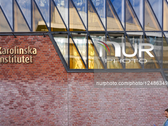 The name "Karolinska Institutet" appears on the facade of a university building in Stockholm, Sweden, on May 6, 2024. The Karolinska Institutet is Sweden's foremost medical university and is internationally recognized for its contributions to medical research and for selecting the Nobel Prize laureates in Medicine.