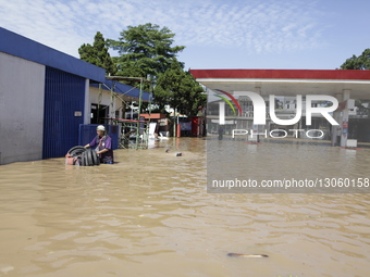 A resident carries a motorbike tire while walking during the flood in Dayeuhkolot, Bandung Regency, West Java, Indonesia. The overflowing Citarum River inundates residential neighborhoods with water levels ranging from 50 centimeters to two meters after heavy rain sweeps through the area, disrupting daily activities and paralyzing transportation access.