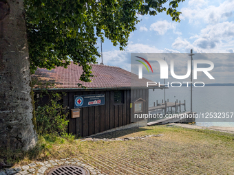 A water rescue station of the Bavarian Red Cross is at Lake Starnberg in Ammerland, Muensing, Bad Toelz-Wolfratshausen, Bavaria, Germany, on July 4, 2025. Wasserwacht Ammerland operates the station.