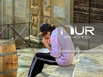 A man wears a pink hoodie and black cap and sits on the weathered stone steps of a monumental building, eating a sandwich from a white paper plate in Arezzo, Tuscany, Italy, on November 22, 2025. A plastic bottle of water and a wooden barrel are visible nearby.