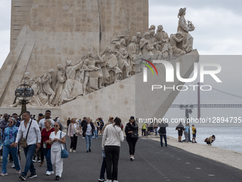 Visitors admire the Monument to the Discoveries (Padrao dos Descobrimentos), located on the banks of the Tagus River. Built in 1960 to commemorate the Portuguese Age of Discovery, the monument honors the nation's great explorers, In the background stands the 25 de Abril Bridge, an iconic red suspension bridge often compared to San Francisco's Golden Gate, connecting Lisbon to Almada across the river on October 08, 2025 in Lisbon, Portugal. NO SALES POLAND