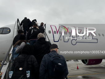 People board Wizz Air plane at the airport in Balice near Krakow, Poland on November 27, 2025.