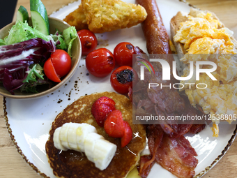 English breakfast is seen on a table in this illustration photo taken in London, Great Britain on July 8, 2025.