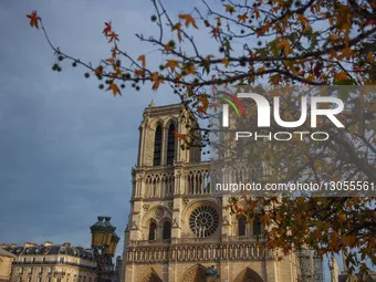 Trees in autumn and view on Notre-Dame Cathedral in Paris, France on November 13, 2025.
