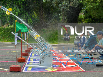 Participants launch rockets made from plastic bottles during the 2025 Sundial Water Rocket Championship in West Bandung Regency, West Java, Indonesia, on September 27, 2025. The competition aims to develop students' potential in science, particularly physics and aerospace, as well as to foster a spirit of competition and innovation to reach the national and international levels.