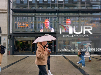 The storefront of Aesthetify, a cosmetic aesthetics clinic run by Dr. Rick and Dr. Nick, features a large digital screen displaying portraits of the doctors above the entrance, as pedestrians with umbrellas walk by on the wet street in Munich, Bavaria, Germany, on October 25, 2025.