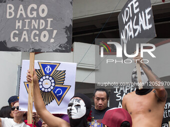 A naked neophyte masked member of the Alpha Phi Omega fraternity is raised behind placards by fellow members during their fraternity's annual ''Run of the Braves,'' also known as the Oblation Run, at the University of the Philippines Diliman in Quezon City, Philippines, on February 14, 2025. Originally a promotional stunt for a play called ''Hubad na Bayani'' (A Naked Hero), the Oblation Run carries political messages since its inception in 1977, with this year's theme calling on voters not to sell their votes in the upcoming Philippine midterm elections on May 12, 2025, as well as the impeachment of Philippines' Vice-President Sara Duterte. The second and third placards read in English, ''Abolish dynasties'' and ''Imee Marcos, get out.''