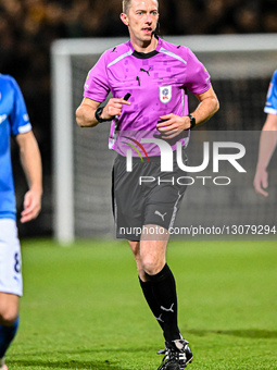 Referee Elliott Swallow observes during the Sky Bet League 2 match between Cambridge United and Chesterfield at the Cledara Abbey Stadium in Cambridge, on December 9, 2025.