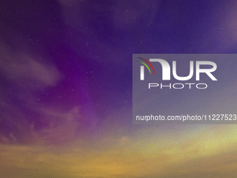 Northern lights appearance in the night sky from rare, geomagnetic solar storm phenomenon. Aurora borealis illumination visible in purple and green color bands from the Dutch countryside. Winterle, Netherlands on May 11, 2024