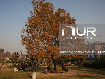 Men sunbathe under a chinar tree on an autumn day in Srinagar, Jammu and Kashmir, on November 13, 2025. Autumn, locally known as Harud, is a season of harvesting in Kashmir with trees changing their colors while the daylight hours become shorter as winter approaches.