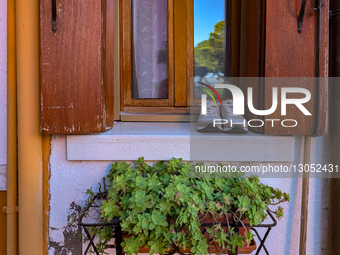A pair of shoes rests on a window sill above a planter box on a residential building on Burano Island in Burano, Venice Province, Veneto, Italy, on November 18, 2025. The close-up detail captures an intimate aspect of daily life within the colorful neighborhood of the Venice lagoon.