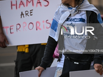 EDMONTON, CANADA - OCTOBER 9, 2023: A member of Edmonton's Jewish diaspora holds a placard with words 'Hamas Are Terrorists' ahead of a unifying rally in the heart of the city's downtown, on October 15, 2023, in Edmonton, Alberta, Canada. On October 7, 2023, Hamas-led militants launched a major offensive on Israel, firing over 3,000 rockets, causing 900+ casualties and a state of emergency. The situation escalated globally: Western nations condemned Hamas, while some Muslim-majority countries blamed Israeli occupation and Palestinian rights denial.