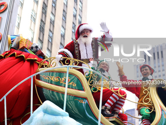 Santa Claus waves to the crowds from on top of the Macy's Santa's Sleigh float during the 99th Macy's Thanksgiving Day Parade in New York, United States, on November 27, 2025.