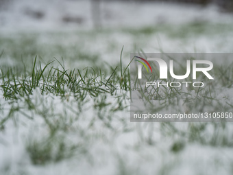 Snow covers the grass on the lawn during the first snowfall this winter in Kyiv, Ukraine, on December 14, 2025.