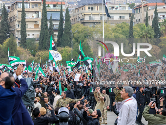 In Damascus, Syria, on December 8, 2025, thousands of Syrians gather in the iconic Umayyad Square in central Damascus, raising Syrian flags to celebrate the first anniversary of the fall of the Assad regime and the end of a brutal 14-year war that claims hundreds of thousands of lives.
