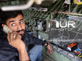 Yahya Akhrayiq, 27, uses a modified Israeli military vehicle abandoned by the Israeli army as a charging point for mobile phones and laptop computers in the Tel al-Hawa neighborhood in the southern part of Gaza City on November 29, 2025. Brothers Yahya and Akram Akhzeiq set up a charging point using solar-energy panels placed on the exterior of the vehicle's hull, which sits under the concrete of a destroyed building.