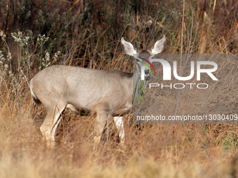 Mule deer forage at Bosque del Apache National Wildlife Refuge near San Antonio, New Mexico. Known for their large, mule-like ears, they can rotate them independently to detect sounds from different directions.