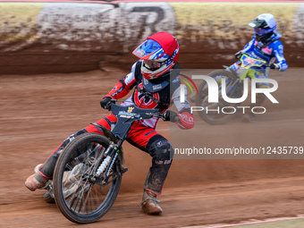 Belle Vue Colts' Freddy Hodder in red leads Oxford Chargers' Jody Scott in white during the WSRA National Development League match between Belle Vue Colts and Oxford Chargers at the National Speedway Stadium in Manchester, on June 1, 2025.