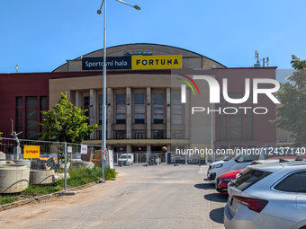 The main entrance of Sports Hall Fortuna, a large arena for athletic and cultural events, stands at the Vystaviste Exhibition Grounds in Prague, Czech Republic, on May 12, 2025. The building features a symmetrical facade and is surrounded by parking areas and ongoing construction works.
