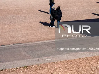 Two women stand and talk in a sunlit open area while another person walks nearby in Leipzig, Saxony, Germany, on March 21, 2022. Strong sunlight creates sharp contrasts between light and shadow on the ground.