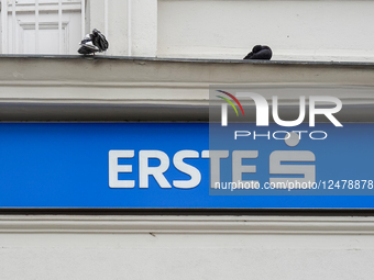 The logo of Erste Bank is on the facade of a bank branch in Vienna, Austria, on June 7, 2025. Two pigeons rest above the blue signage of the Austrian financial institution.