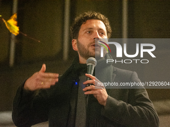 Felix Banaszak, a member of the German Bundestag from the Gruenen party, speaks during the rally as more than a hundred people take part in the rally against Chancellor Merz's statement on city planning in Duisburg, Germany, on October 28, 2025.