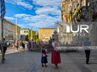 A mother and daughter wear traditional Bavarian dress and stand near the fountain at Marienplatz, with the New Town Hall and Mariensaule visible in the background, in Munich, Bavaria, Germany, on September 21, 2025.