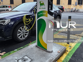 A white electric vehicle (e-car) charges at a Plenitude (''on the road'' brand) charging station installed on a city street in Florence, Italy, on November 21, 2025. The charging cable is plugged into the vehicle's rear charging port, which has a protective flap open.