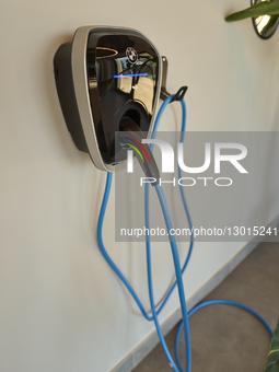 A full-frame view of a BMW Wallbox electric vehicle (EV) home charger is mounted on a light-colored interior wall, with its distinctive blue charging cable coiled below it in Bari, Italy, on November 22, 2025. The blue light indicator on the charger is visible, suggesting it is active or in standby mode, representing residential EV charging infrastructure.