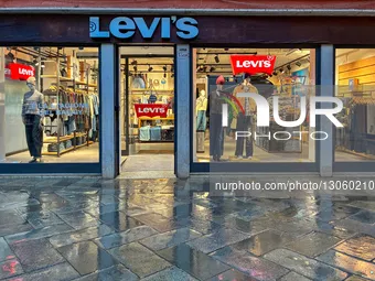 A Levi's brand clothing storefront features mannequins, denim jeans, and other apparel on a wet stone-tiled street in Venice, Veneto, Italy, on November 16, 2025. Levi Strauss & Co. is an American clothing company and one of the world's largest apparel marketers, globally recognized as a leader in the denim and jeans sector.