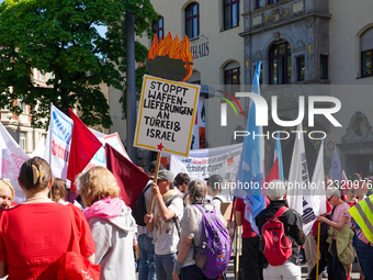 Demonstrators hold a sign reading ''Stoppt Waffenlieferungen an Turkei & Israel'' (''Stop arms deliveries to Turkey & Israel'') during a Labour Day protest organized by German trade unions in front of the historic Burgerhaus in Munich, Bavaria, Upper Bavaria, Germany, on May 1, 2025. The protestors call for an end to German arms exports and highlight peace, human rights, and anti-militarism as key May Day themes.