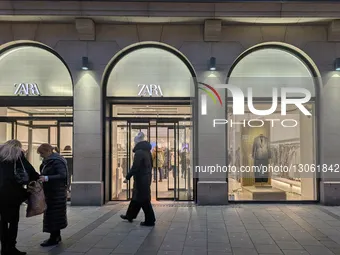The entrance and arched window displays of the Zara fashion retailer feature clothing mannequins and visible shoppers on a paved city street in the late afternoon. The store is located in Munich, Bavaria, Germany, on December 5, 2025. Zara is the flagship retailer of the Inditex Group, a major Spanish fashion company known for its fast fashion approach to clothing, accessories, and beauty products.