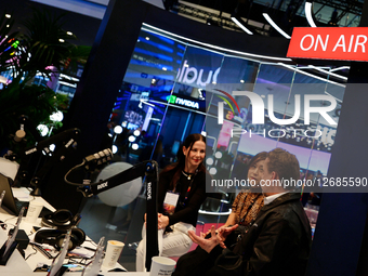 One man and two women record a podcast in a professional studio with microphones, headphones, and an illuminated ''On Air'' sign in the background during the Mobile World Congress 2025 in Barcelona, Spain, on March 5, 2025.