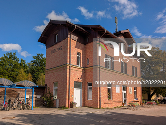 The Huglfing railway station building with bicycles parked outside is pictured in Huglfing, Weilheim-Schongau district, Bavaria, Germany, on October 2, 2025. The Upper Bavarian village receives the gold medal in the Entente Florale competition for ''Europe's Most Livable Places.''